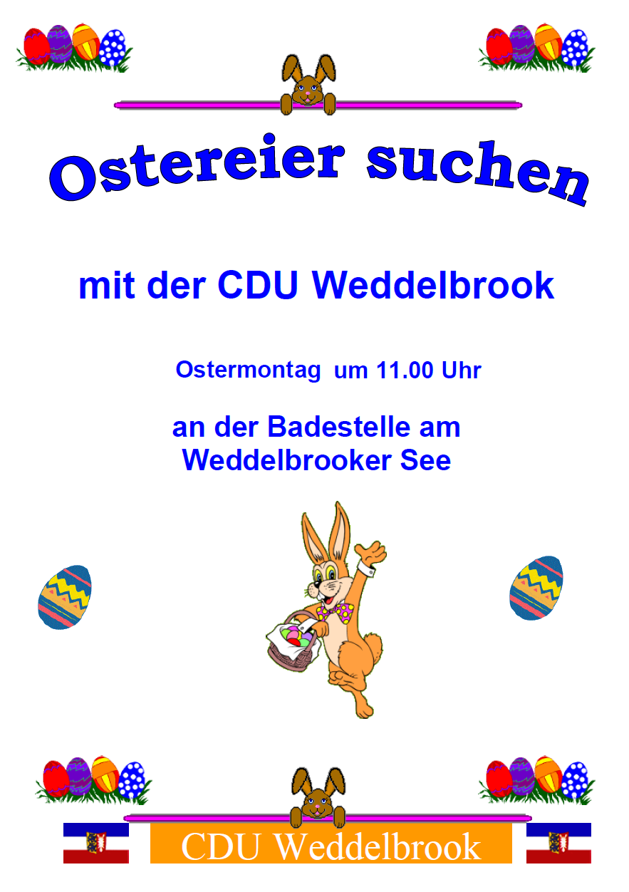 Am Ostermontag den 6. April um 11Uhr lädt die CDU Weddelbrook zum traditionellen Ostereier suchen an die Badestelle am Weddelbrooker See.